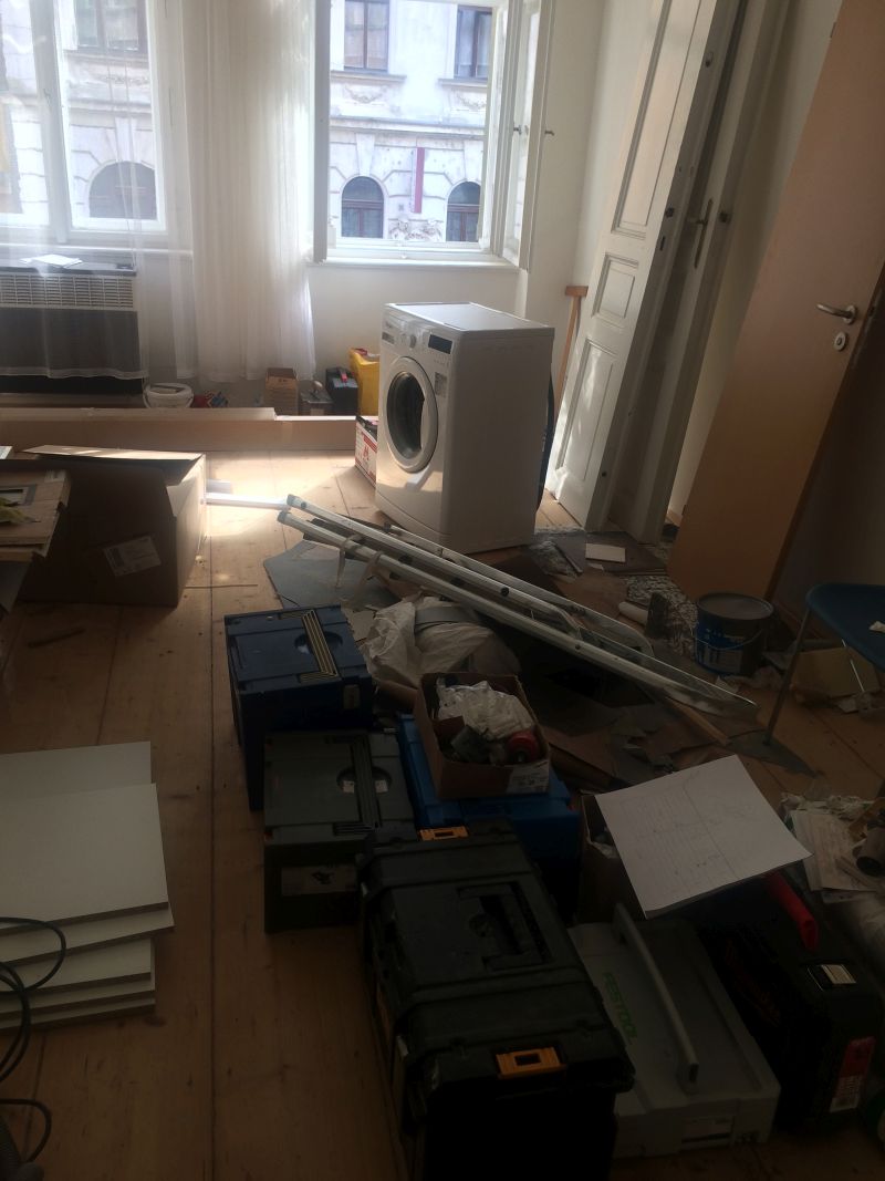 Včera ráno metrem na Vltavskou, pak na úřad pro parkovací karty (ano, je to strašná pakárna, že za každý 2 hodiny musíte zaplatit 120 Kč anebo za 10 hod 4 stovky). Stojím ve frontě, truhlář už volá, že je před domem. Skoro běh tam. Před domem 4 chlapi a dvě dodávky, na parkovací karty kašleme, budu koukat z okna. Do bytu se skoro nevejdeme, kór když přijede ještě elektrikář a Kryštof mezitím uklízí po podlahářích, protože truhláři nemají místo na práci.