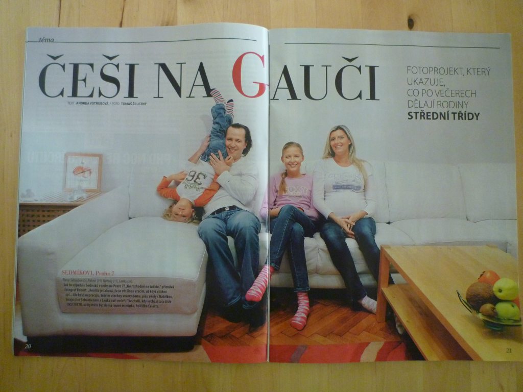 Zakoupila jsem si na víkend několik čtecích časopisů (pak jsou ještě prohlížecí). V Instinktu je zajímavá fotoreportáž z českých obýváků, kde střední třída mluví o tom, co dělá v sedm večer. Zajímavé je, že snad vůbec nikdo nesedí na gauči u televize. Což jinak dělá 70% české populace. Tak jsem zapřemýšlela o sobě – a taky nesedím. Ani v sedm, ani nikdy. Pokud už sleduju televizi, tak od jídelního stolu – a od počítače. Neměla bych to říkat, ale když už, pak u televizního programu smažím obvykle scénáře. A vy pak namítnete, že pak to podle toho taky vypadá. 🙂