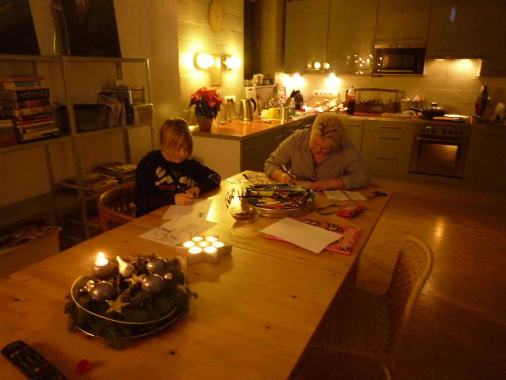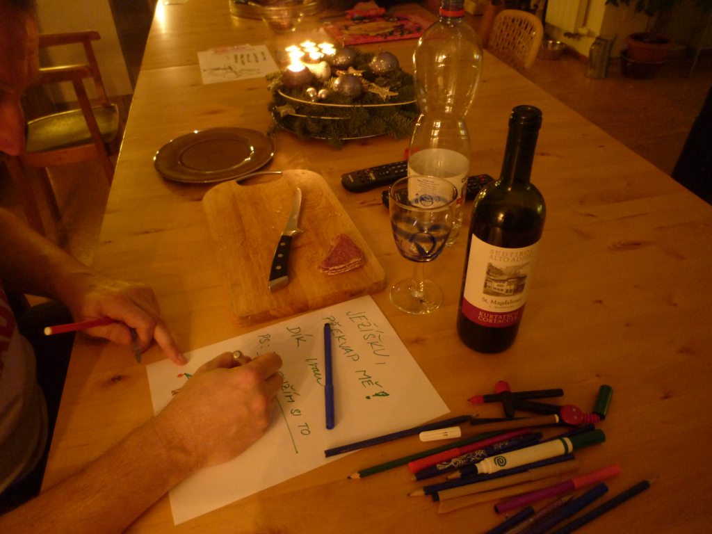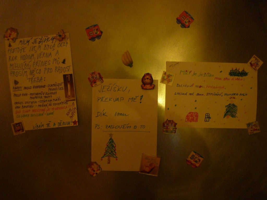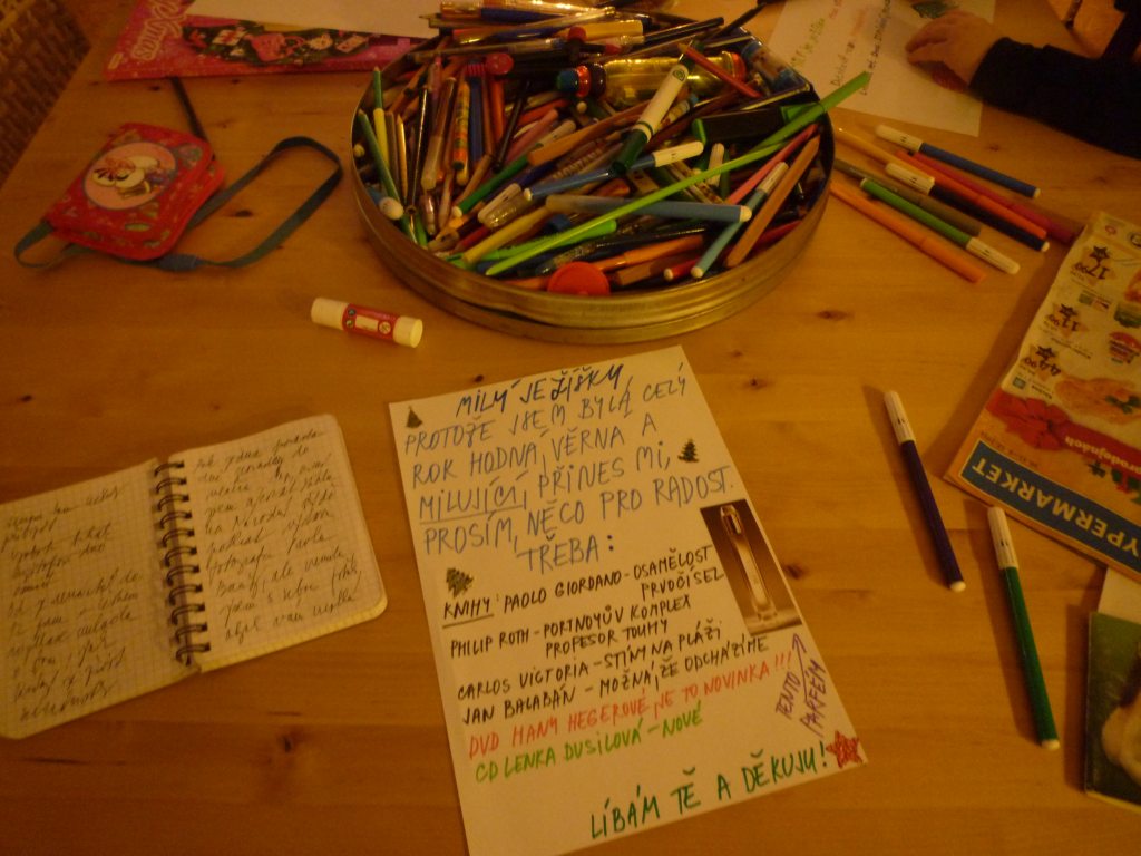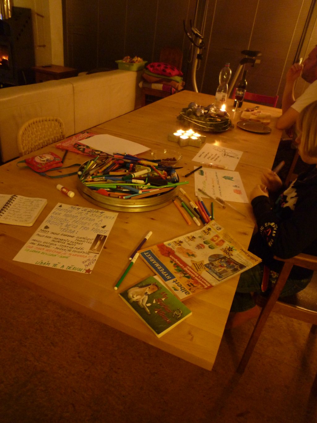 Taky jsme v zajetí reklam (viz Stelin seznam), ale fakt je, že večery máme pěkné, společné. Po těch všech stěhováních jako základ vidím VELKÝ jídelní stůl (náš má skoro 3 metry). Místo dopisu pro Ježíška tam mám normálně noťas a všichni u stolu sedíme a děláme si to svý (včetně dívání se na Simpsonovi) a ono to vnáší do těch večerů takovej nějakej klid nebo co … ale někdy se taky perem, ne že ne.