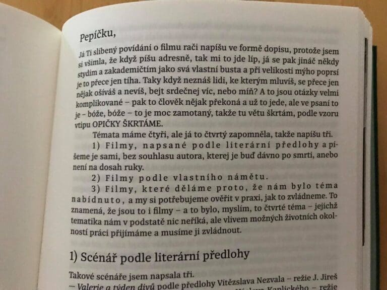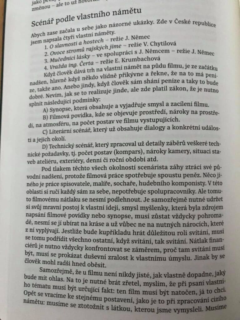 Právě vyšla kniha o Ester Krumbachové, která je aspoň pro někoho známá tím, že spolupracovala s Věrou Chytilovou. Psala scénáře. Třeba K Sedmikráskám nebo k filmu Ovoce stromů rajských jíme. Taky spolupracovala s Janem Němcem. A napsala scénář k Faunovu velmi pozdnímu odpoledni. Což je asi můj nejoblíbenější film vůbec. Znám ho slova od slova. Tahle kniha je parádní, podle ní by se měli scenáristi učit. Síla myšlenek. Osobní zkušenost. Ne nějaký schémata. Je v ní všechno, včetně nerealizovaných scénářů. A že jich je. Taková škoda. Pořád říkám, že scénář je na rozdíl od knihy mrtvá věc. Pokud scenárista nesežene režiséra, režisér producenta a producent peníze, nikdy ten příběh nespatří světlo světa.