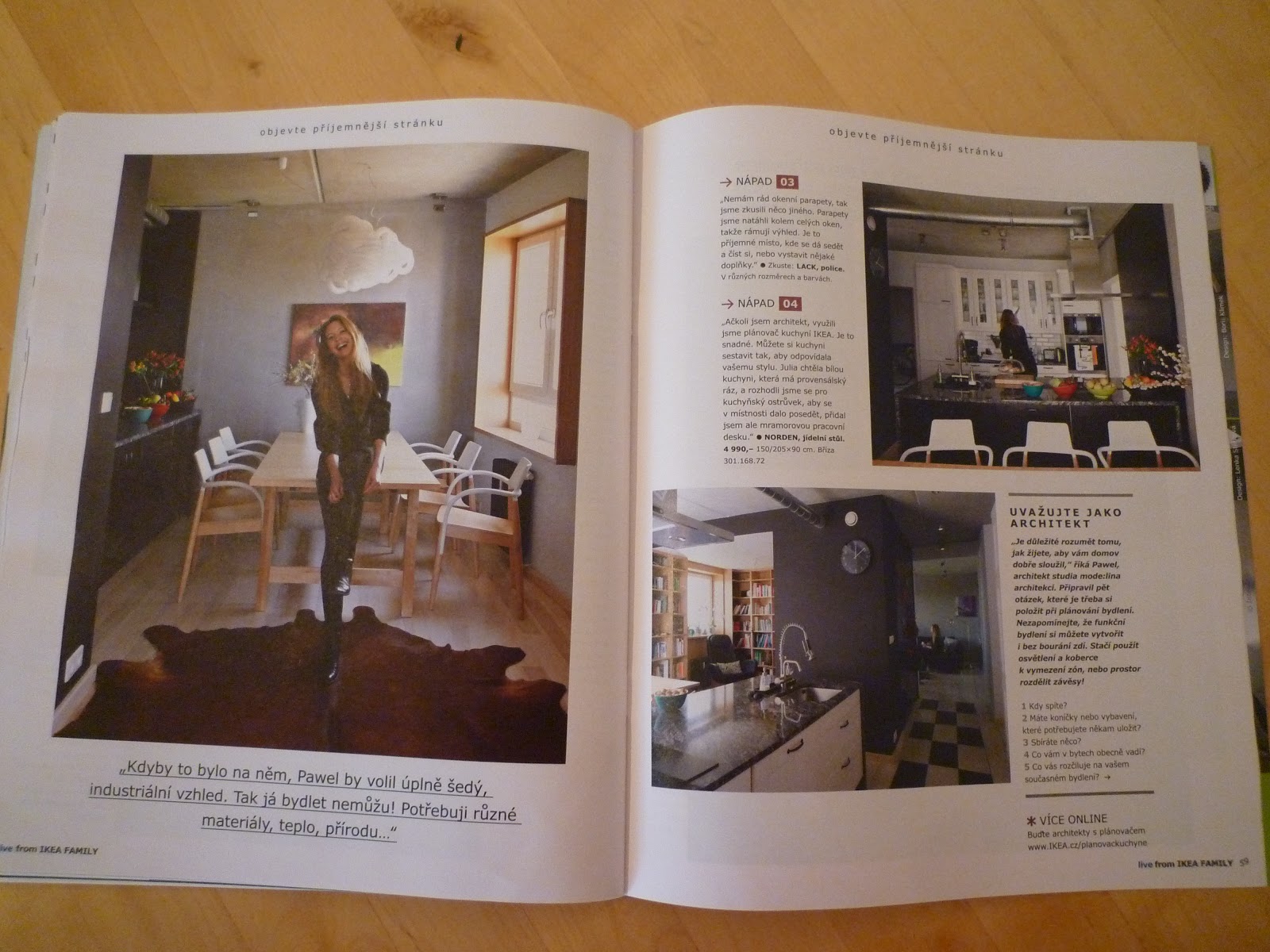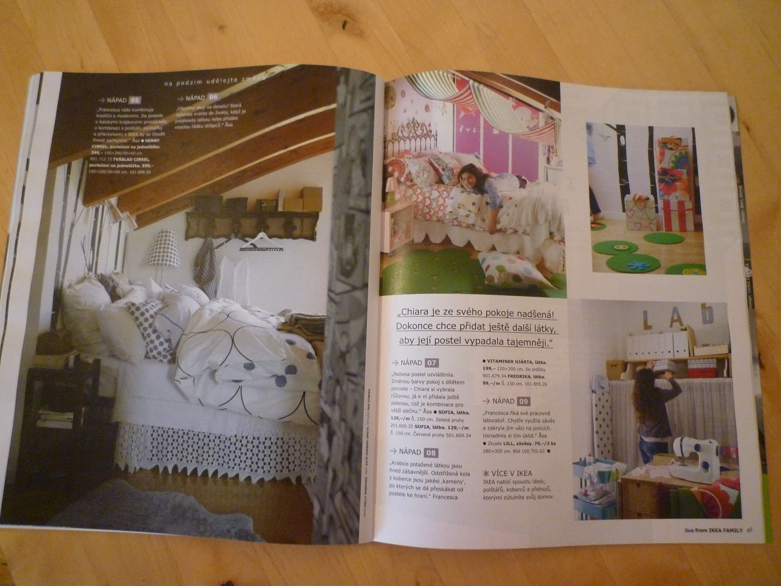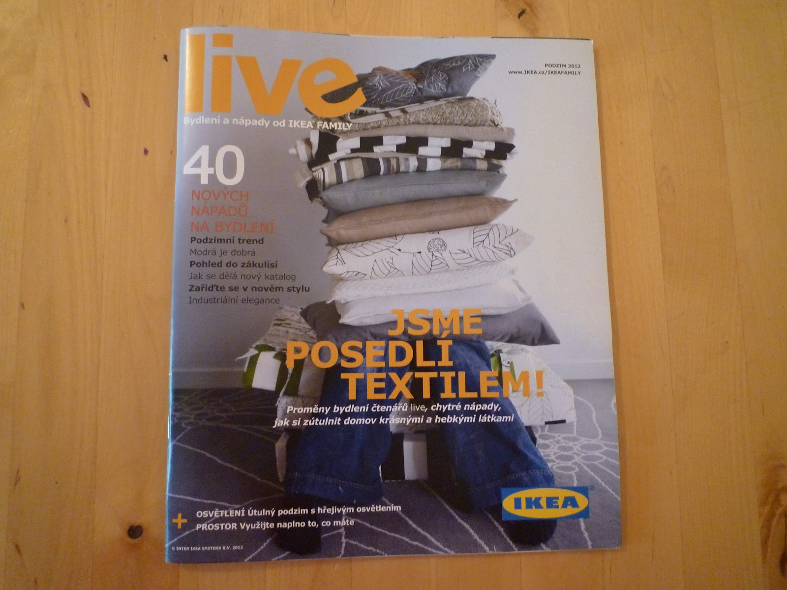 Zjistila jsem, že to, co mě nejvíc baví na Ikea (pořád lavíruju, jestli to slovo skloňovat či ne) jsou její časopisy. Hrozně se mi líbí skutečné byty, ve kterých je Ikea využitá a zkombinovaná s jinými druhy nábytku. A nejvíc mě zajímají osudy lidí z těch bytů. A navíc je to pozitivně napsané, což je v dnešní době hrozně potřeba. Úplně mě to hladí.