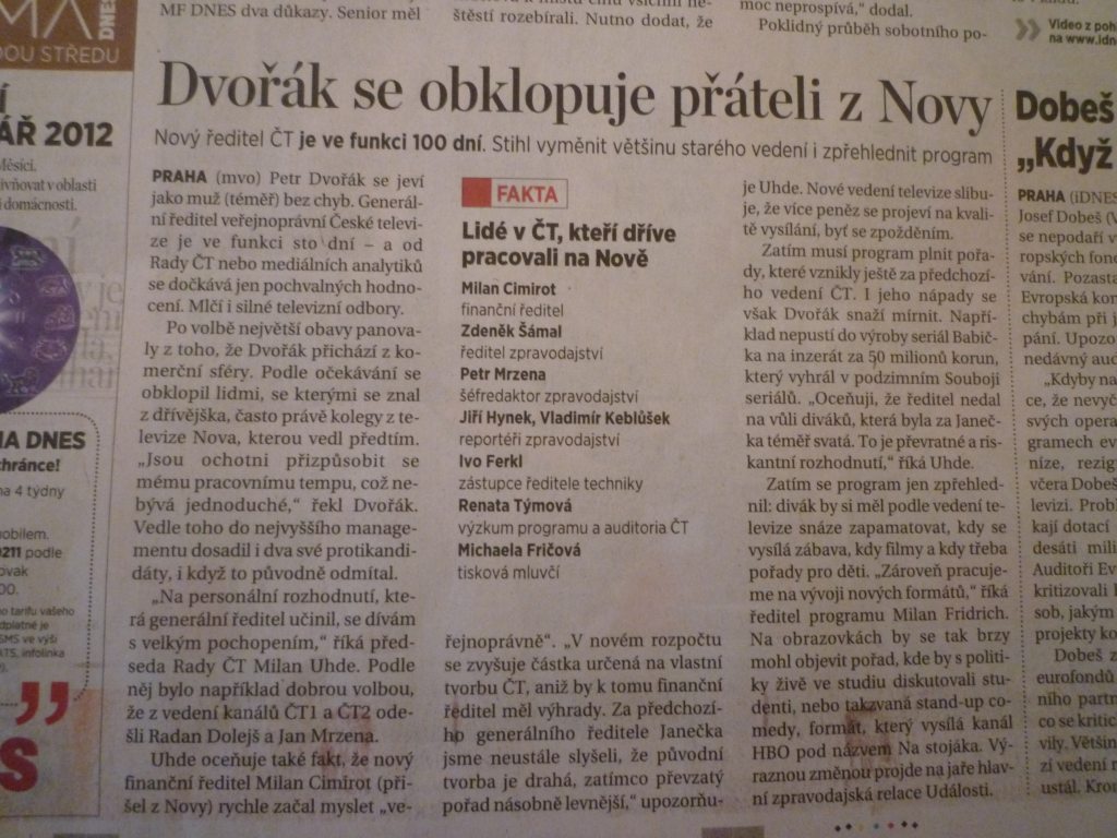 Ve včerejší Mladé frontě Dnes vyšel článek, ve kterém Milan Uhde říká, že ačkoli naše Babička na inzerát vyhrála Souboj seriálů, ředitel Dvořák ji prý nepustí do výroby. Zajímavé na tom je, že v prosinci měl Eallin (producent seriálu) pro vedení ČT prezentaci Babičky a ta byla ředitelem, finančním ředitelem a dalšími přijata jednohlasně. Ještě nikdy se ale nejednalo o konkrétním rozpočtu, který je v novinách zmiňován. Takže na to všichni hledíme jak zjara, protože se to dočítáme z novin. Že by tohle bylo to zprůhledňování? No nic, jsem klidná a hlavně zvyklá. Naštěstí nemám napsaný ještě ani jeden díl, na rozdíl od jiných projektů, kde jsem měsíce psala a natáčení (takže i zaplacení) se nekonalo. Bohužel duševní práce a její vlastnictví jako by v Čechách pořád neexistovalo, takže nemáte legitimní nárok na nic.