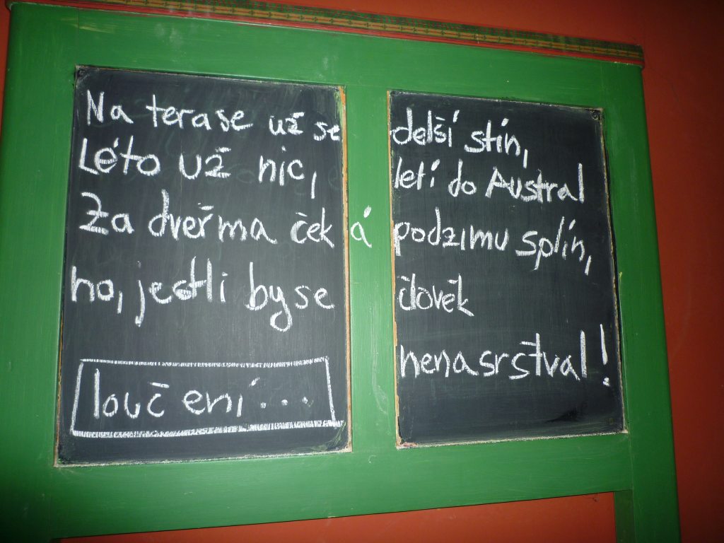 Do toho doma zabíjačka. Nedobrovolná. Vlak nedaleko nás porazil divoké sele. Scéna jak ze Slavností sněženek. Kryštof s klukama ho přivezli v kolečku a pak nám tu viselo. Pes na něj skákal, Stela plakala a litovala ho. Ivan s pomocí Kryštofova kamaráda ho rozporcoval. V pátek bude divočáková párty, páč Kryštof dnes dostal roční pracovní vízum do Kanady a příští týden už chce odletět. Aby měl nějaké peníze s sebou, prodává dnes auto. Jak jinak takhle narychlo – než nevýhodně. V tom jsme mistři světa. A taky se nám dramaticky ucpal odtok v kuchyni, takže zítra ho přijede speciální jednotka prošťouchnout. A co ještě? Spousta! Ale já si jdu dát drink. To mi dělá náramně dobře za každé situace.