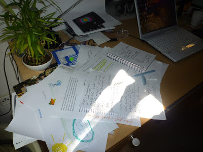 Moje víkendová příprava k zítřejšímu jednání. Papíry, poznámky, obrázky, němé ach jo. Konec školního roku a já dostala nabídku, které se buď musím začít intenzivně věnovat hned, nebo ji nevzít. Co bude dělat celé prázdniny Stela? Je to seriál na cizí téma. V zásadě se práce scenáristy rozděluje do tří kategorií: vlastní projekt, přizvání k projektu kolegy, najatý dělník na cizí projekt. Tahle práce je ta dělnická – nejnechutnější kategorie. Během ní si totiž často říkáte, jak to, že televize dala přednost tomuto průměrnému projektu před vaším úžasným a geniálním?! Což se mi přesně stalo. Ale nabízejí mi poměrně velkou svobodu, takže bych se mohla místy i radovat. A na konci prázdnin splnit Stele sen – jet na dovolenou „bytovým“ autem. Nebo taky nejet, což už se mi stalo několikrát, že nakonec jede za rodiče jenom Ivan, protože já nemám dopsáno.