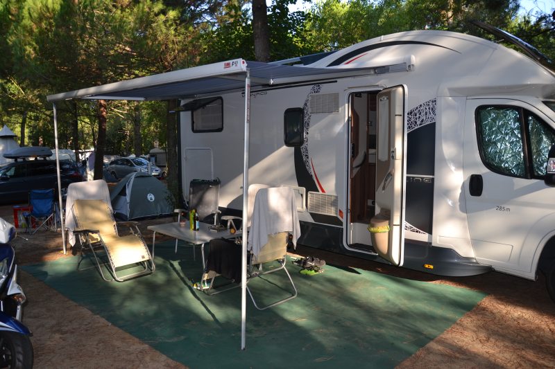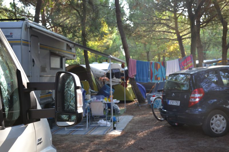 V prvním kempu nás opět nevezmou, nemáme rezervaci, tudíž máme smůlu. V druhém si dokonce můžeme vybrat místo. Strada 32 nebo 36 v piniovém háji.
