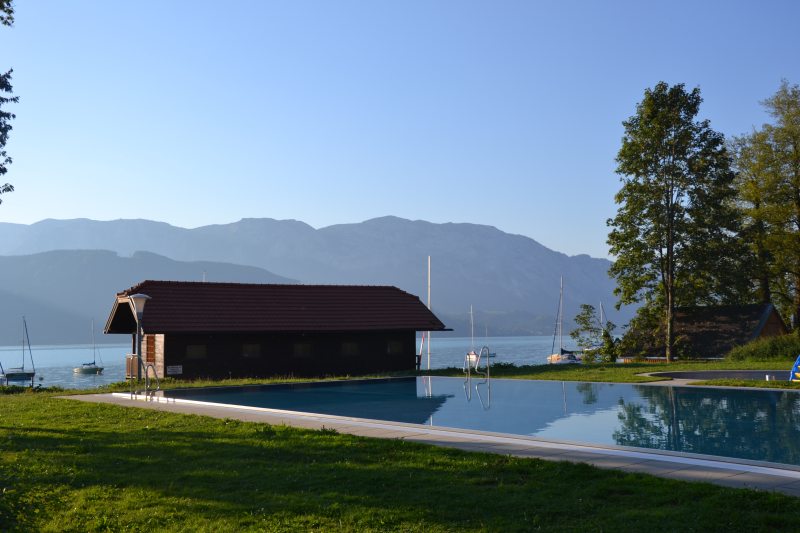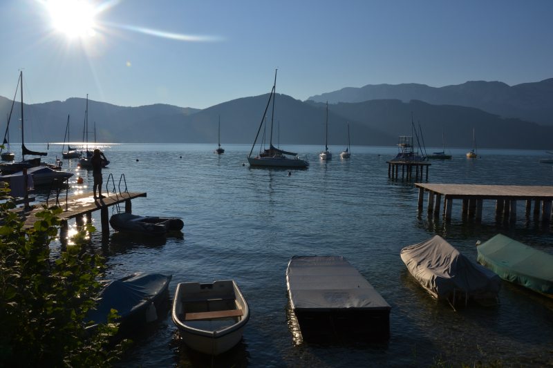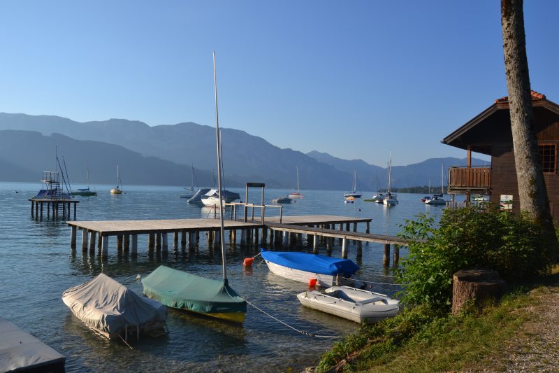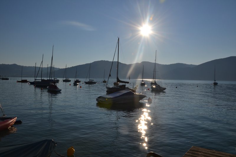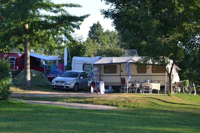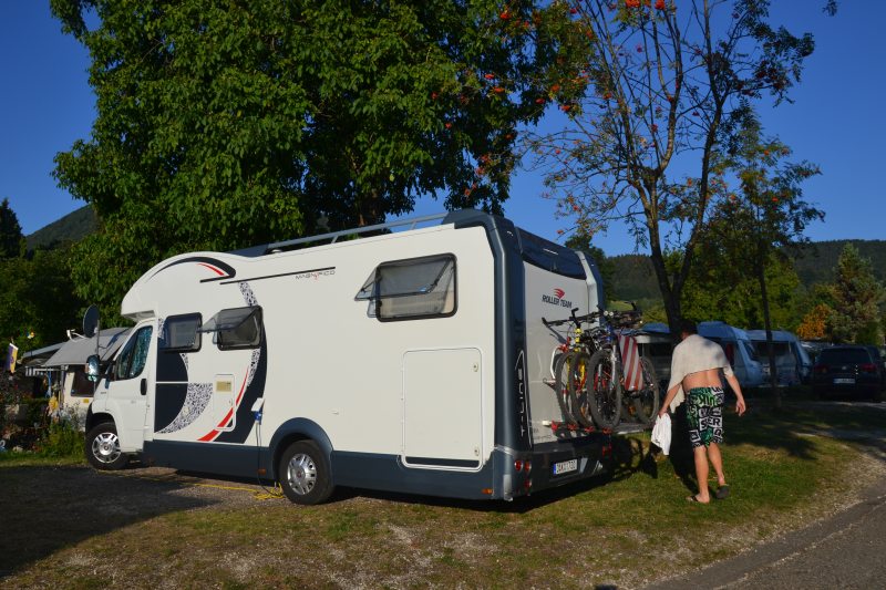 Přejíždíme 500 km zpět do Rakouska, ale k jinému jezeru, než jsme byli první den. Tohle má být malý kemp přímo u jezera, už nejedeme úplně nazdařbůh. A opravdu, je to tu nádherné. Od cesty směrem k vodě romantika, od cesty směrem ke kempu opět klasika. Jeden přívěs namačkán na druhý, třetí, atd. Tady navíc slunce praží přímo, nejsou tu stromy, které by mírnily palbu. Máme poslední místo, bohužel je u umývárek, takže celou noc nám svítí červená světla do oken a kolem naší hlavy chodí lidi na záchod. Zatáhnout nemůžeme, protože bysme se uvařili. I s větráním je v karavanu přes třicet stupňů. Naštěstí je tu úžasná restaurace s výhledem na jezero, ceny solidní, takže si dáváme večeři a několik panáků, abysme poslední noc nějak přežili.