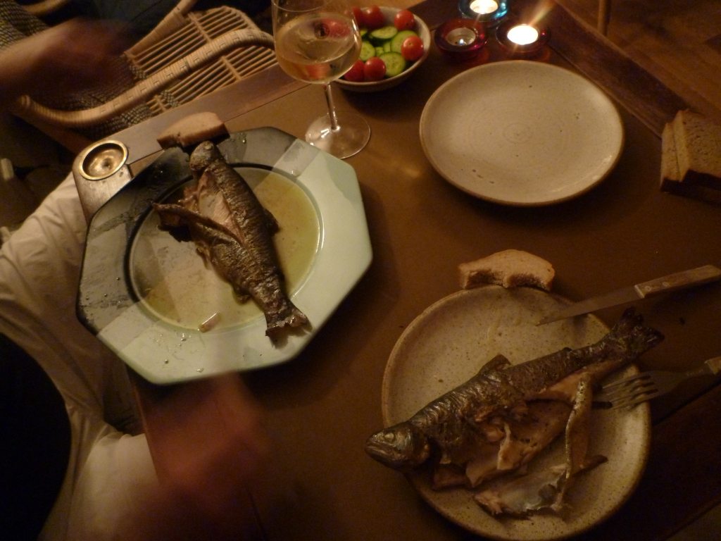 Pár kilometrů od naší chalupy je rybářství s živými plovoucími rybkami. Na kterou si ukážete, tu můžete mít. Ukazujeme si dost často a když pak leží smutně na talíři, vždycky si vzpomenu na památnou větu z Potkali se u Kolína. Ryby jsou nejpříjemnější částí dnešního večera, protože jinak sedím nad opravami scénáře (toho ne mého, prozatím tajného seriálu), který jsem napsala špatně. Bohužel jsem to sama nepoznala. Až když mi přišel celý červeně přeškrtaný od dramaturga. Nejdřív jsem na to koukala jak zjara a po dvou hodinách jsem uznala, že má pravdu. Myslím, že dokážu uznat svou chybu/chyby. Jsou tam ale místečka, která nedám. Většinou vtip, který by měl být nahrazen přesnějším vyjádřením, aby i natvrdlý divák pochopil. Natvrdlí holt budou mít v dílu 21 smůlu.