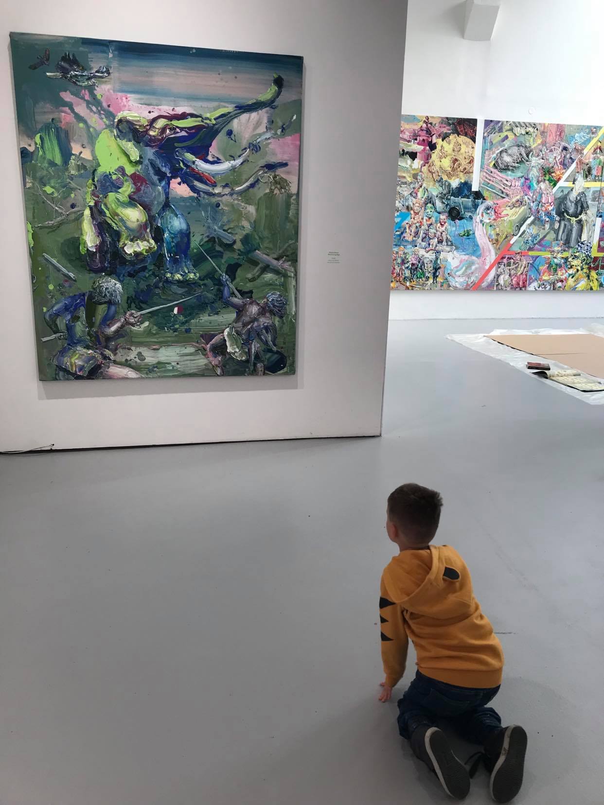 Jsou worshopy pro děti, ze kterých mám největší radost já. V Trafogallery se v sobotu konala výtvarná akce pro děti mezi obrazy Michaela Rittsteina. Mého oblíbence. Takže já jsem tam jen půl hodiny seděla a koukala na obraz. Stela s Tobísem kreslili, ale brzo ho to přestalo bavit, páč radši po něčem leze nebo si chce něco koupit či jít do hospody. Všechno jsem mu splnila. Nenechte se mýlit, že jsme tam sami, přišli jsme tam zase první. Moje úchylka. Pak už bylo narváno.