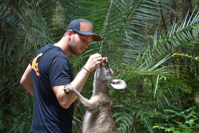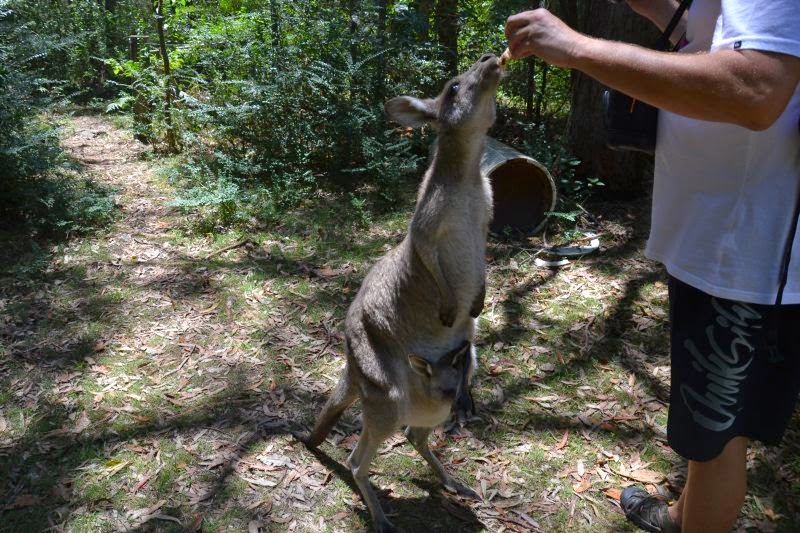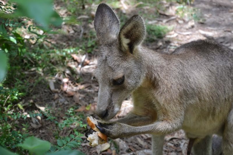 Klokani běhali – teda asi spíš skákali – ve volné přírodě. Nalákali jsme je na sladký hrozinkový chleba. Vypadají jako ti plyšoví. Nejdřív jsem se jich bála, ale byli roztomilí.