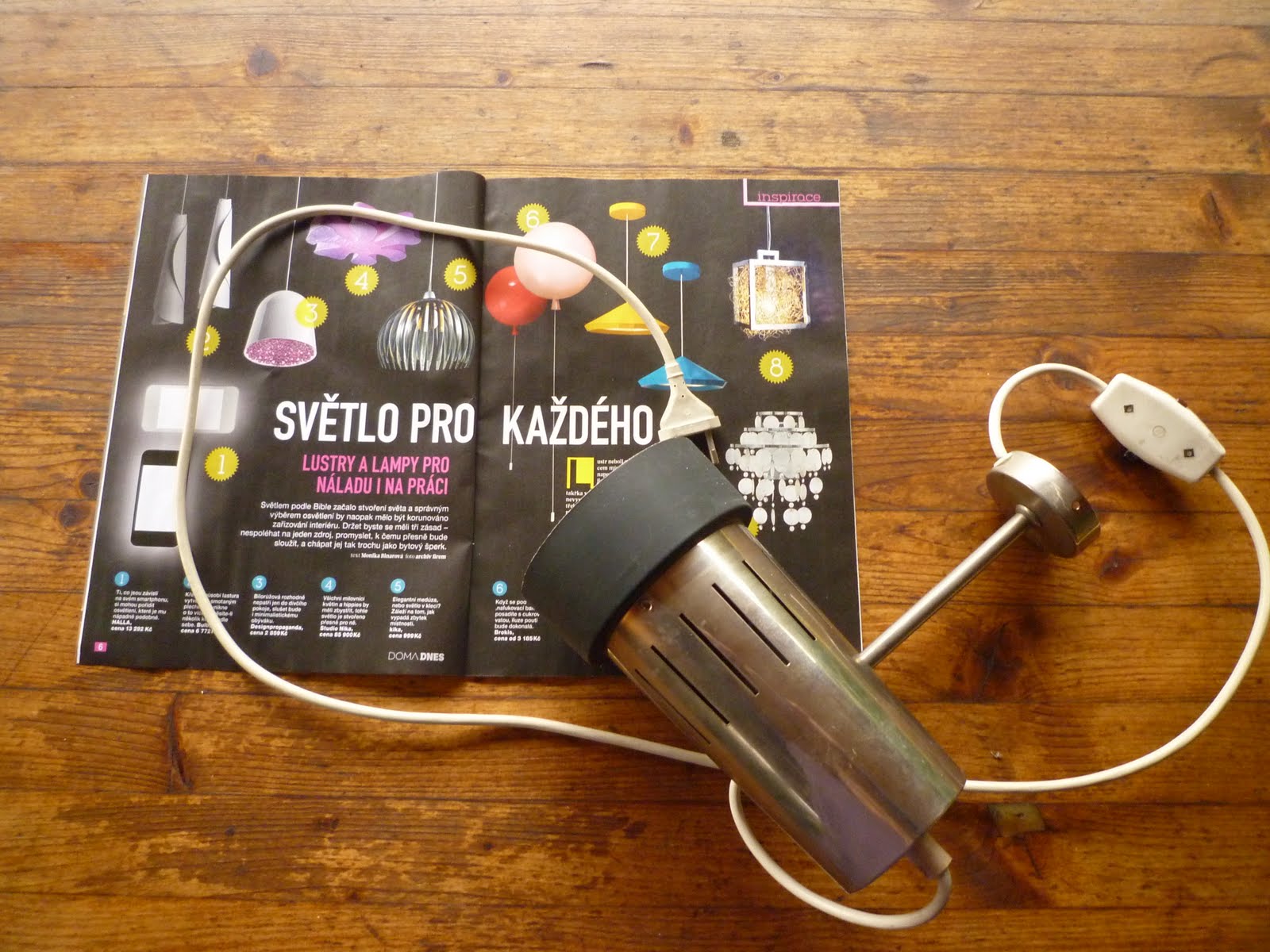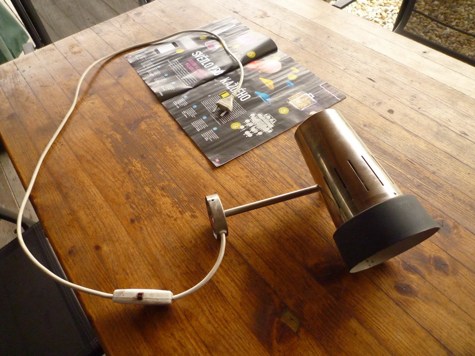 No jo, tak jsem si zase koupila něco z aukra. Lampička stála míň než lístek na mhd. A svítí! A má uprostřed šňůry takovej ten přepínač na svítí/nesvítí. Akorát jsem si při koupi nevšimla, že jí chybí cosi, za co by se dala přichytit na zeď. Nevadí, poradím si. Nechám ji někde jen tak položenou. Akorát to nesmí být nikde blízko mého muže, protože jsem dostala manželské napomenutí, že jestli budu tahat domů ten reálnej socialismus, tak se mnou Ivan nechce bydlet. Jiní se toho zbavují a já to kupuju. Snažila jsem se muže přesvědčit, že ale v kombinaci se současnými designovými kousky to bude vypadat opravdu dobře. Akorát škoda, že žádnej designovej kousek jsem narychlo doma nemohla najít …