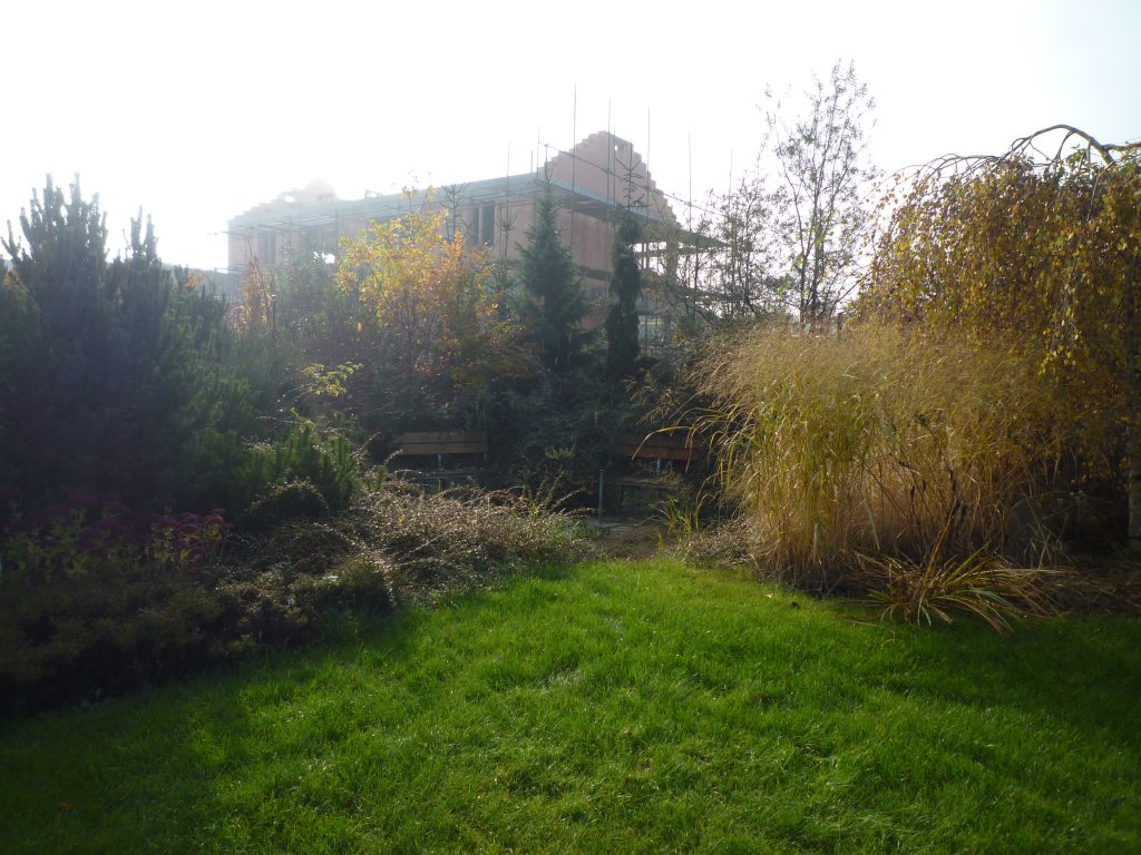 Naschvál jsme si postavili přízemní dům, abysme s ním vrostli do zahrady. Což se nám během pár let krásně podařilo. Tohle nám ovšem v levém rohu vysekl soused. Má to být dvoupatrová extravagantní vila. Zatím to vypadá jako bytovka. Pořád nechápu, proč lidi, který maj hodně peněz, vyšvihnou na malým pozemku něco tak gigantickýho. Dnes přijdou zahradníci a společně vymyslíme, jak levý roh na jaře komplet přesadit, abysme souseda neviděli.
