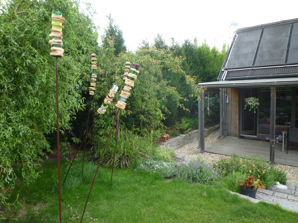 Tyhle rezavý tyče s keramikou a sklem jsou umělecké dílo! Ve větru se nádherně hýbou. Jmenujou se Bojínek (podle trávy) a vysochatila je Iva Ouhrabková.