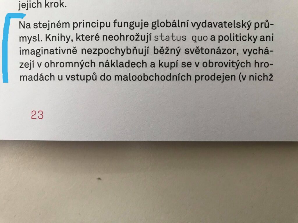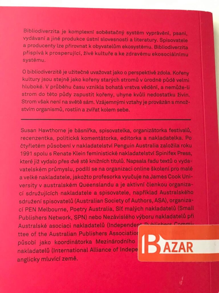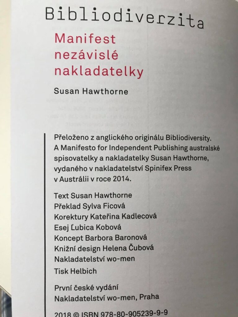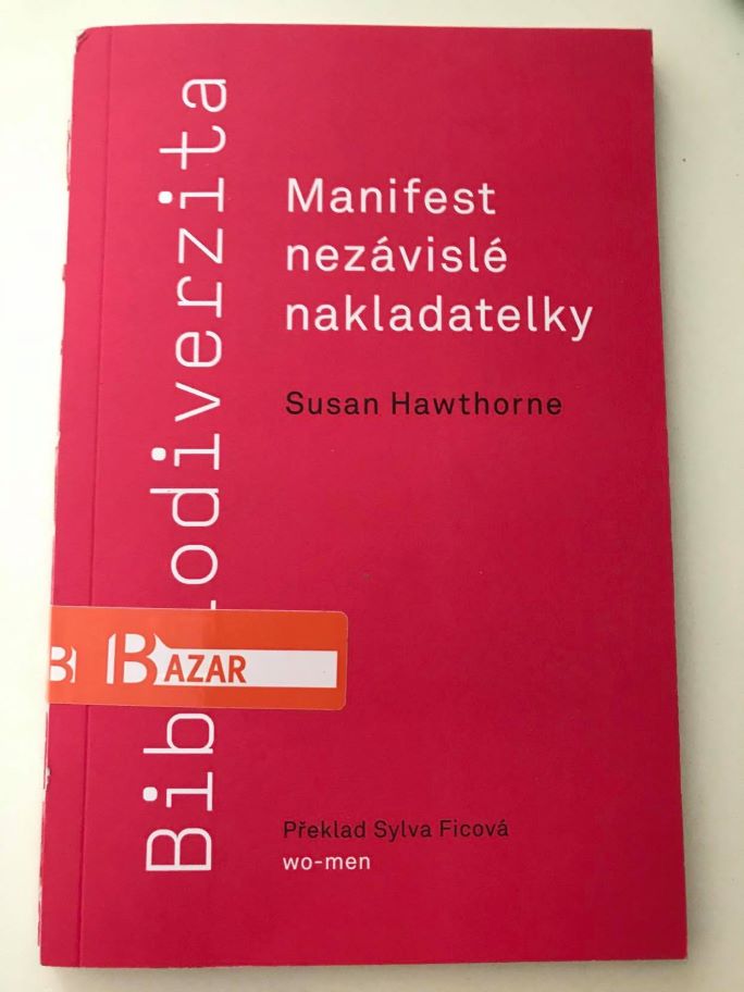 Tuto knihu vydalo nakladatelství Wo-men, ale já si ho paradoxně objednala z bazaru na Kosmasu. Paradoxně proto, že právě Kosmas je knižní mega platforma, proti které se vymezuje australská spisovatelka, básnířka, editorka a nakladatelka Susan Hawthorne.