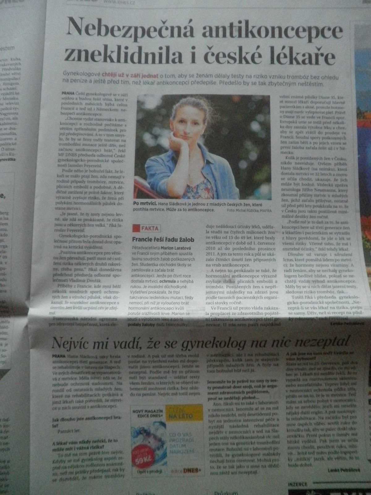 V tištěné víkendové MF Dnes (ještě ji seženete) vyšel konečně alarmující článek o používání antikoncepce a jejích dopadech. Jde zejména o to, že se vás lékaři neptají, jestli máte v rodině potíže se srážlivostí krve, protože se jim následně nechce dát vám dělat drahý test na rizika trombóz. Naší Monice ho dokonce odmítli udělat, přestože její otec měl opakovaně trombózu a ona na to upozorňovala. Nechci samozřejmě paušalizovat a všechny lékaře házet do jednoho pytle, ale děje se to.