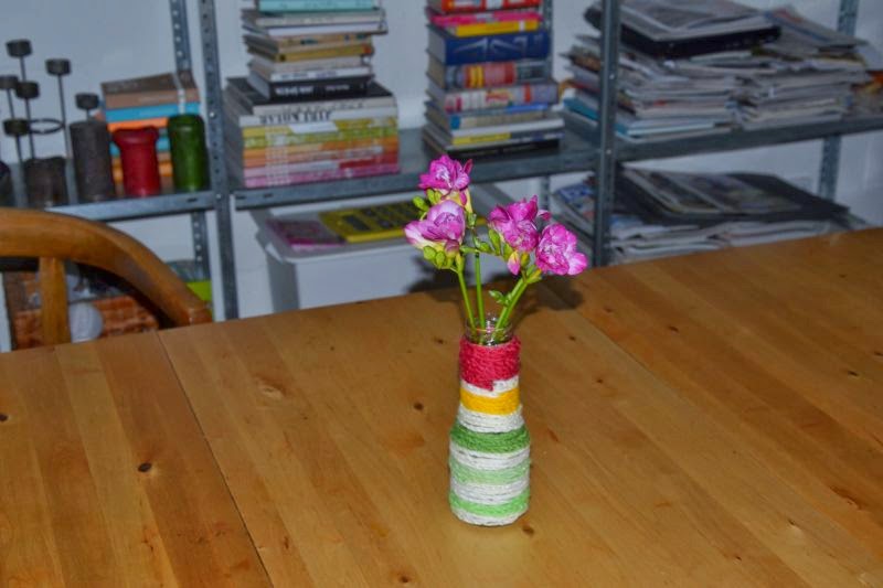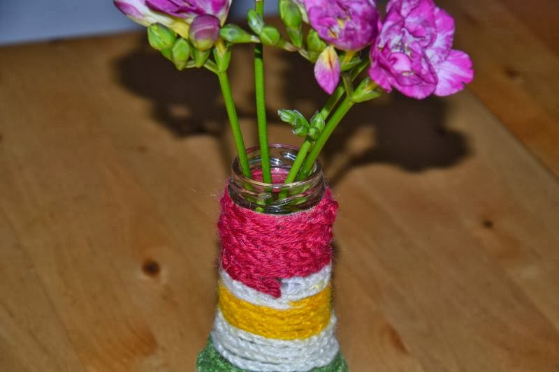 Vázu dělala Stela ve škole, když ji přinesla, dost mě to pobavilo, protože něco podobného jsme kdysi vytvářeli ve škole i my. Vy ne? Ale dnes mi to přijde jako dobrý retro. Dokonce frézie jsem do ní dnes koupila!