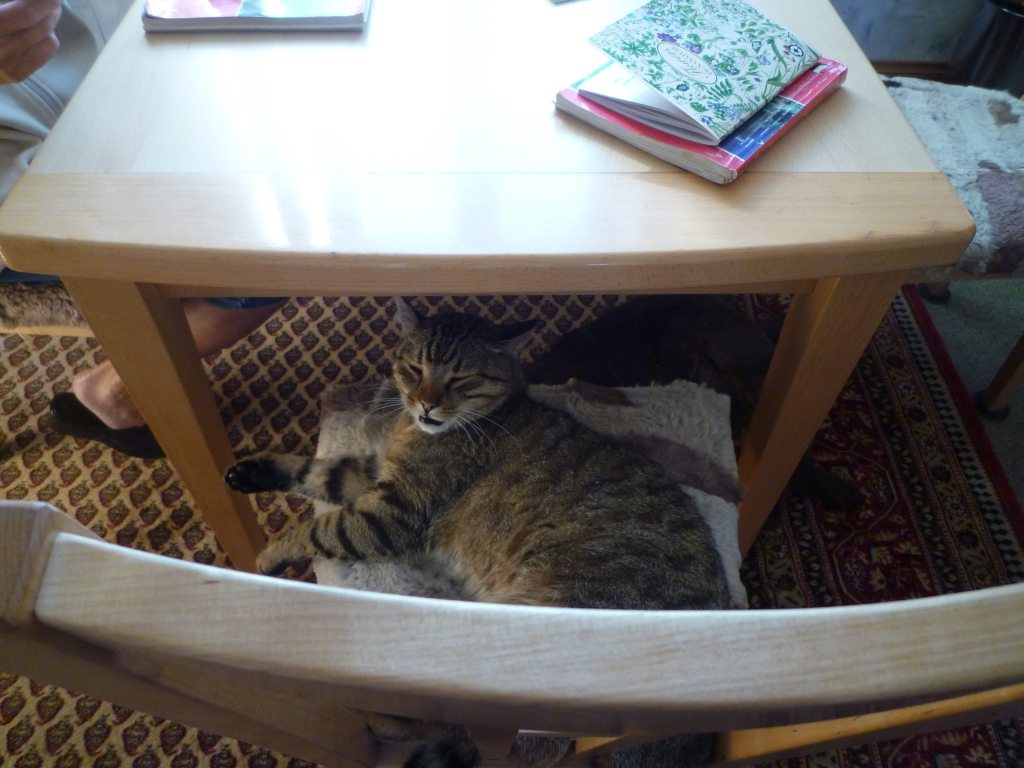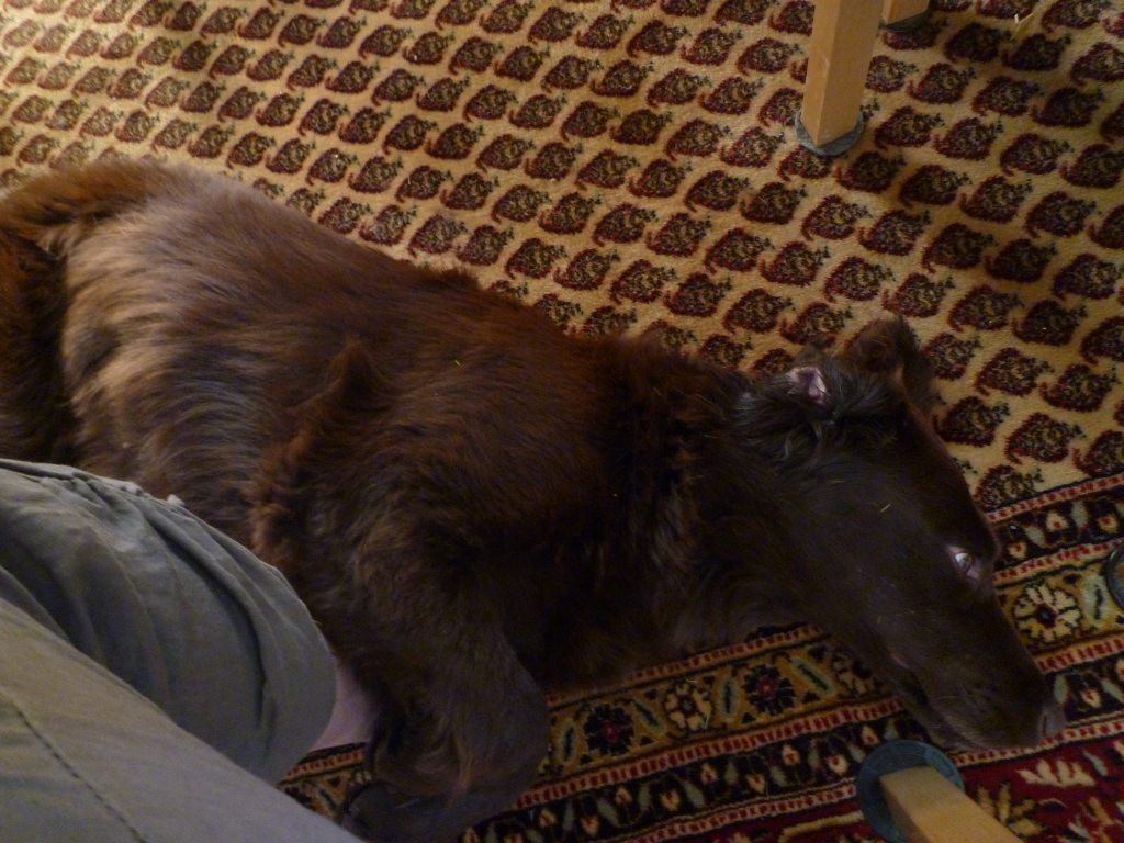 Moje noha a Janina fenka Gaia. Jenny by žárlila. Všichni psi mě okamžitě zaléhavají.