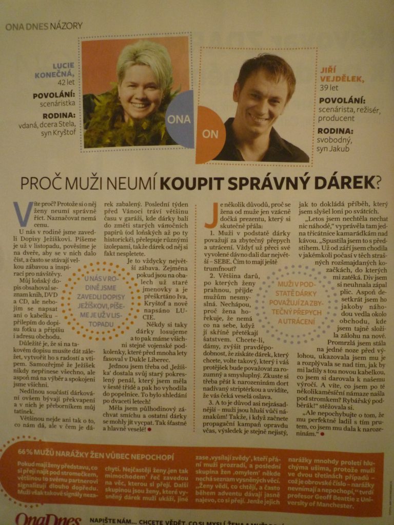 Příjemně mě překvapil taky časopis KRAUS, jsou tam zajímavé články, jiné než v profláknutých časopisech. Úplně nejvíc mě zaujal rozhovor s Marshou Kocábovou, bývalou ženou Michaela Kocába. Z pohledu cizinky dává Čechy do úplně nových souvislostí. Tvrdí například, že čeští muži vidí v manželce buď milenku nebo babičku. Nic mezi tím. Přečtěte si to.