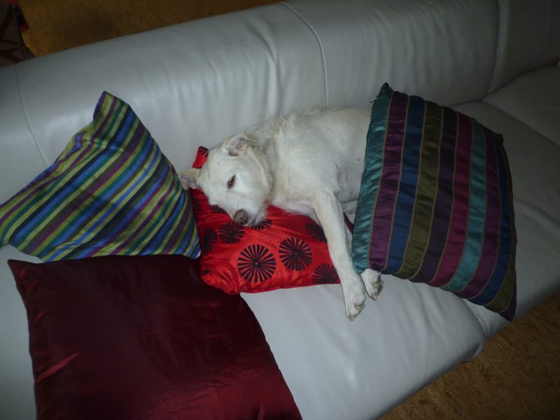 Tohle je Jenny, můj psací pes. Vyfotila jsem ji po ránu, kdy se snaží někam zdekovat a nepřekážet, protože u nás vrcholí ranní boj pěti lidí o koupelny, zrcadla, rohlíky, tiskárnu, omluvenky do školy, prostě o ČAS!!! Takže ideální je se rozvalit do polštářů na sedačce. Trochu blafuju, protože jsem jí přikryla velké břicho, aby vypadala hezčí. Je jí už 11 let, ale její narozeniny neznáme, protože jsme si ji vzali z útulku. Hned nám porodila štěňata, která nikdo nechtěl. Nesnášela děti, kulhající lidi v montérkách, někdo jí hodně ublížil. Stačilo prudce zvednout ruku a ona lehala k zemi. Postupem času nejvíc přilnula ke mně a kdykoli uslyší cvakání klapek počítače (jako právě teď), vyskočí a jde si mi lehnout k nohám. Proto o ní říkám, že je to psací pes. Doufám, že mi ještě chvíli vydrží.