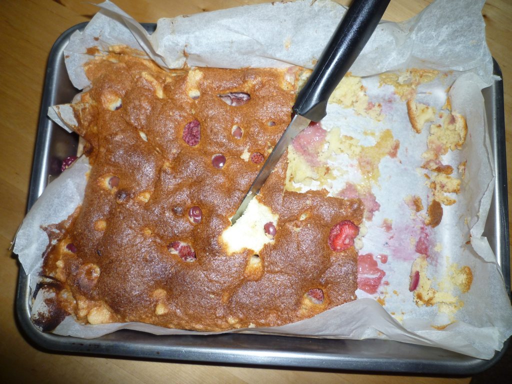 Takhle neesteticky vypadá bublanina pár minut poté, co jsem ji vytáhla z trouby. Všichni se na ni vrhli a trhali. Dnes se mi obzvlášť povedla, ačkoli jsem tam dala místo normálního oleje extra virgin olivový (který se k pečení prý nehodí, hahaha), takže se těsto odmítalo spojit a bylo chvíli zelené. Když jsem ho vylila na plech, tak jsem zjistila, že jsem dovnitř zapomněla dát ušlehané bílky, tak jsem je tam vmasírovala až těsně před žehem. Ale pořád jsem si věřila. A taky jo! Výsledek ohromující, už nezbyl ani drobek. A ještě budeme extra virgin zdraví.
