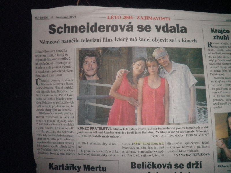 Pokud budete mít čas a náladu, v neděli od 20 hod vysílá ČT1 film Ruth to vidí jinak, který režisérka Jitka Němcová natočila podle mého absolventského scénáře. Bylo to skoro před deseti lety.