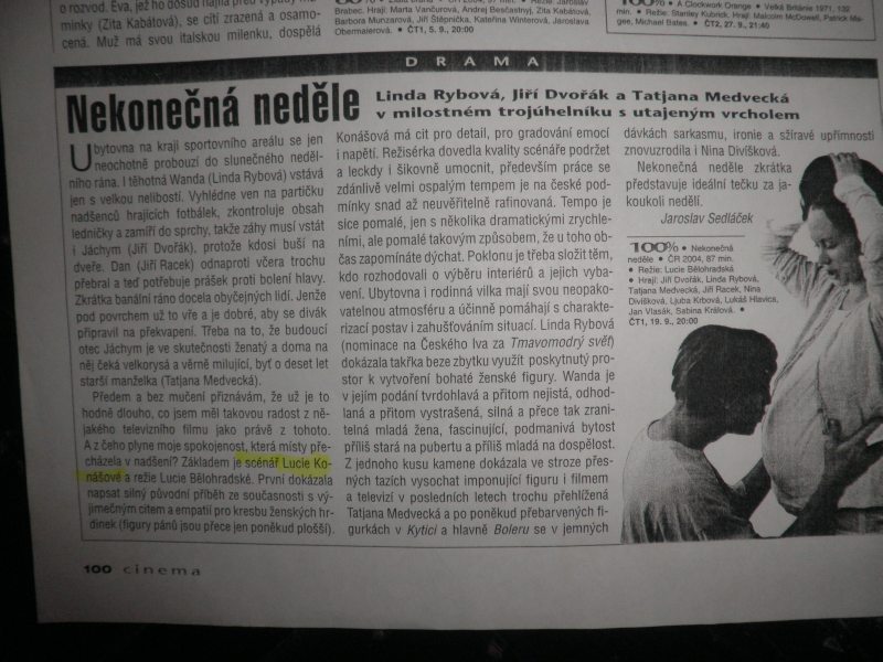 Když jsem film viděla hotový, musela jsem si na něj trochu zvyknout. Příběh, který mi běžel při psaní před očima, byl jiný. Neříkám, že lepší nebo horší … prostě jiný. Dost mě to překvapilo, protože rok předtím točila můj bakalářský scénář Nekonečná neděle Lucie Bělohradská a ta natočila přesně to, co mi opravdu při psaní běželo před očima. Bohužel už jsme spolu pak neměly příležitost nic točit.