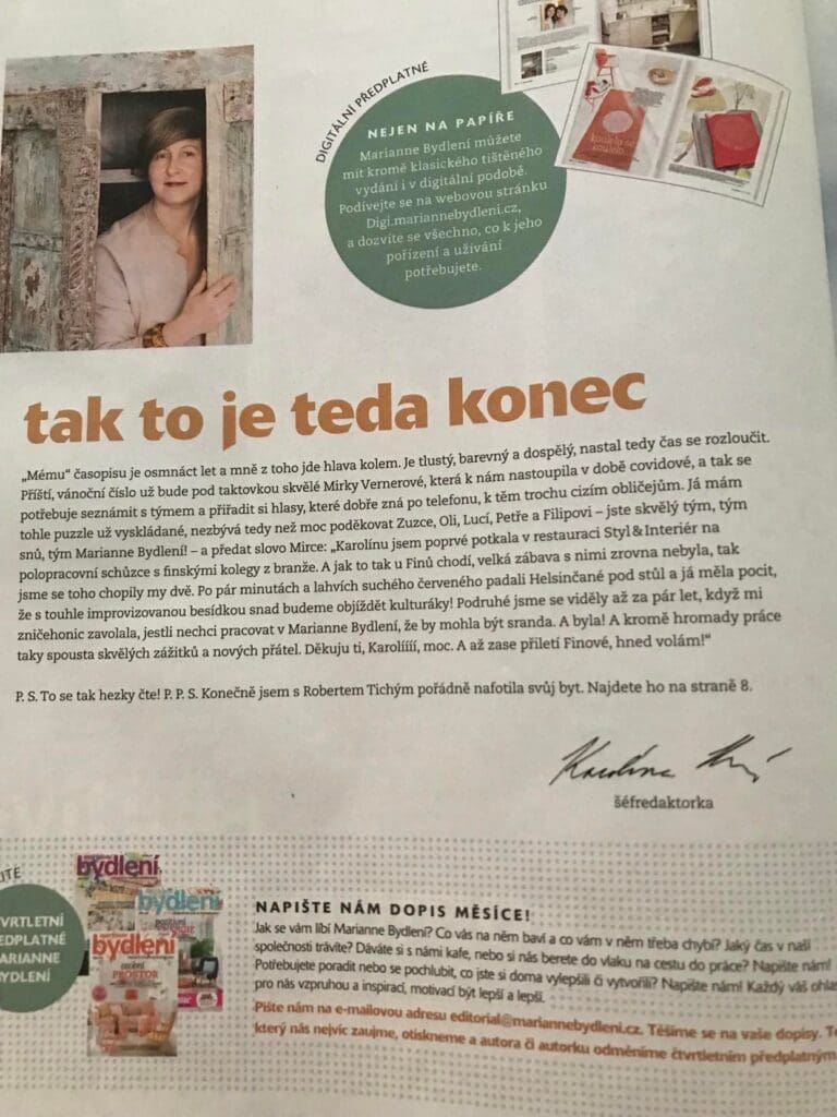 Listopadové číslo Marianne bydlení je posledním, které vzniklo díky kreativitě šéfredaktorky Karolíny Hůlové. Dál už bude časopis pokračovat bez ní. Což mě hrozně mrzí. Věřím ale, že i dál to bude ten nejlepší časopis o bydlení, který je na trhu.