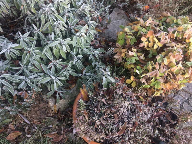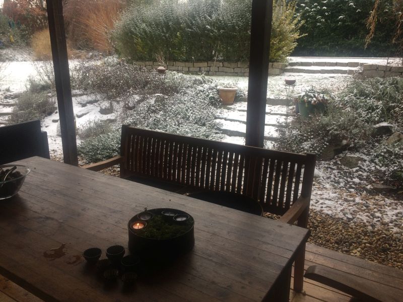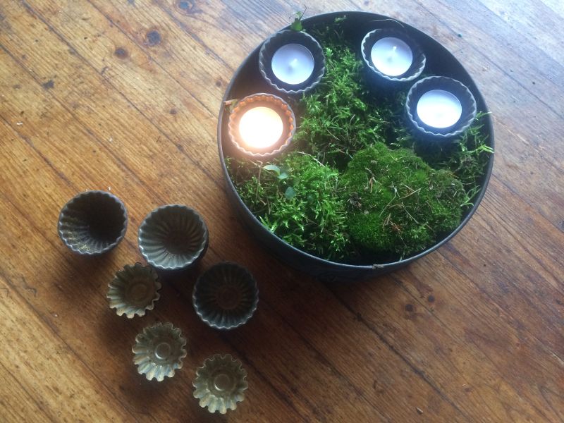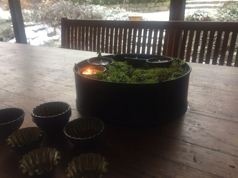 Krmítka pro ptáky jsou naplněna, kytky v květináčích jsem zazimovávala včera. Bylo to teda těsný, protože dnes už sníh. Adventní věnce máme dva, jeden klasickej s jehličím, šípky a ostružinami, a druhej z mechu. Koupila jsem na něj starou do černa vypálenou formu na dort a stejné hodně použité formičky. mech je přírodní ze včerejší procházky s kočárkem a se psem.