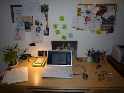 Dnes jsem se pod vlivem svátku věrozvěstů donutila uklidit si pracovní stůl. Pod nánosy papírů už nebyl vůbec vidět. Našla jsem i několik (dlouho hledaných) pokladů, jako např. náramek nebo poslední výzvu k zaplacení pojistky. Ale v tuhle chvíli už mám na stole další kila poznámek, takže mi moc dlouho uklizený nevydržel. Ale v přehledném nepořádku (není to nesmysl?) se stejně cítím nějak líp. Trávím tu teď zase spoustu času, de facto žiju se svým pracovním stolem. Plánuju ho vyměnit, protože mám radši staré věci s duší, ale ještě mě v tomto směru nepotkala opravdová láska. Tenhle stůl je normální. Posloužil mi, vymyslela jsem u něj spoustu věcí, je celkem hezký (vivat IKEA), příjemný na omak, má šuplíčky, ale nemiluju ho. Je to tak strašlivé přiznání, že mi ho je najednou líto. Nezaslouží si to. Přísahám, že ho jednou daruju jenom tomu, kdo ho bude mít opravdu rád!