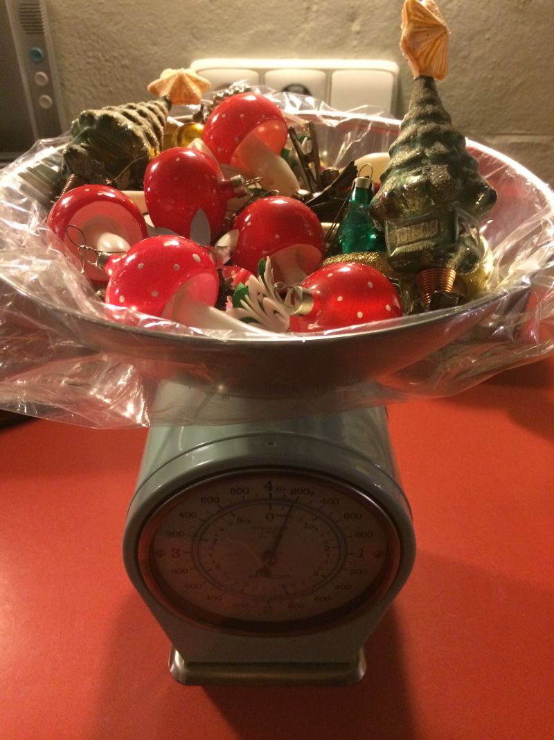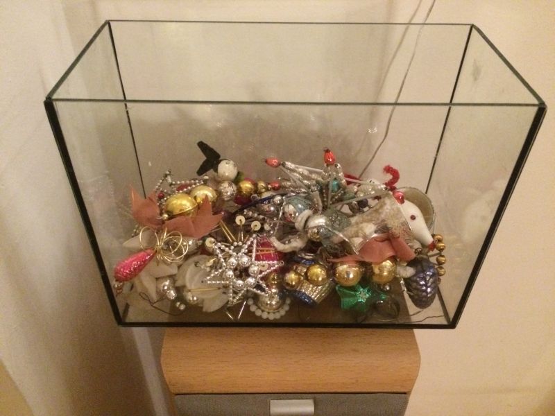 Koupila jsem novou váhu, ale vážit v ní nemůžeme, protože tam mám houbičky a stromečky. Stromečky jsou tuze vzácné. Další ozdoby jsou třeba v akváriu a v míse na bramborový salát.