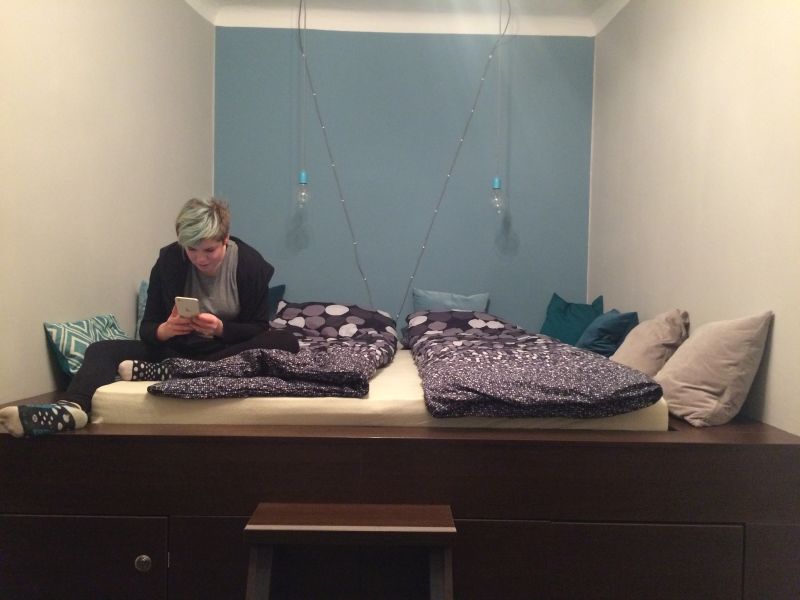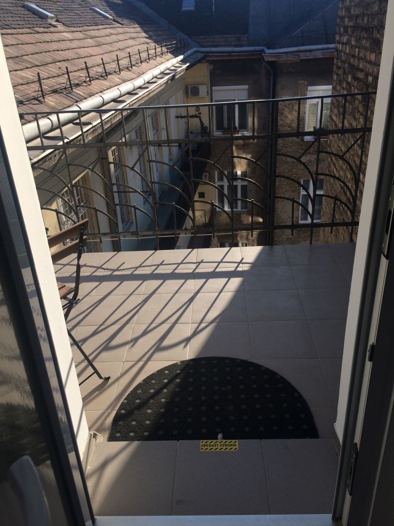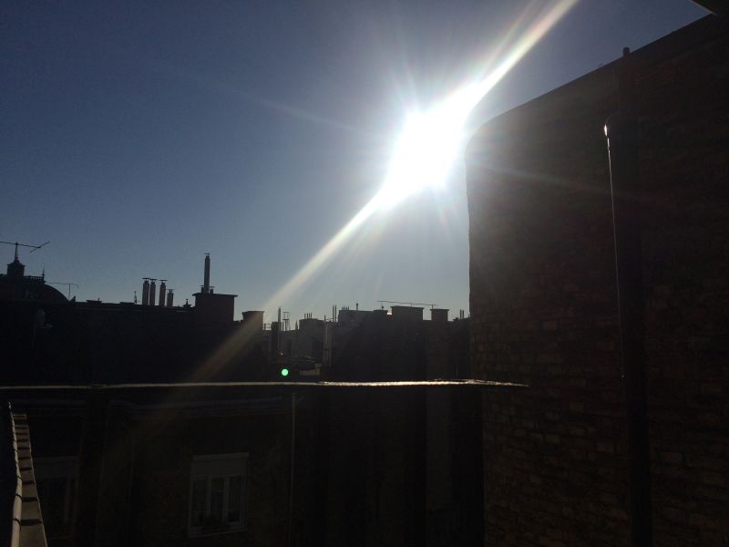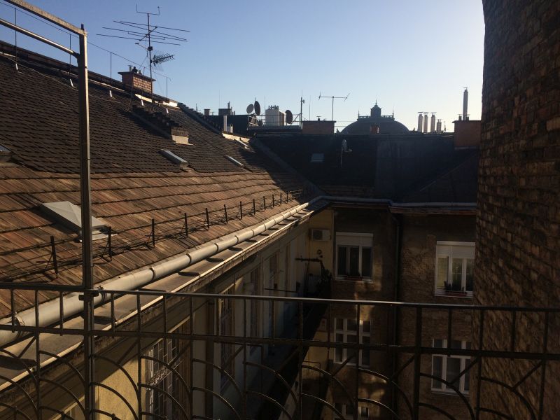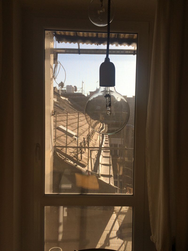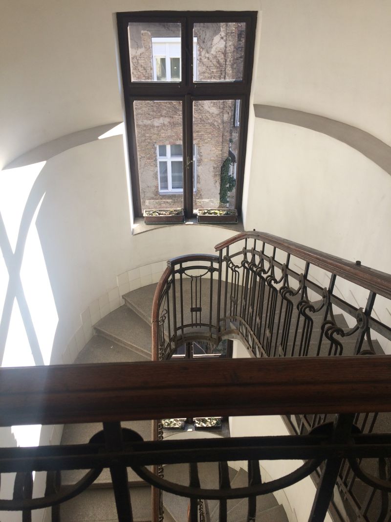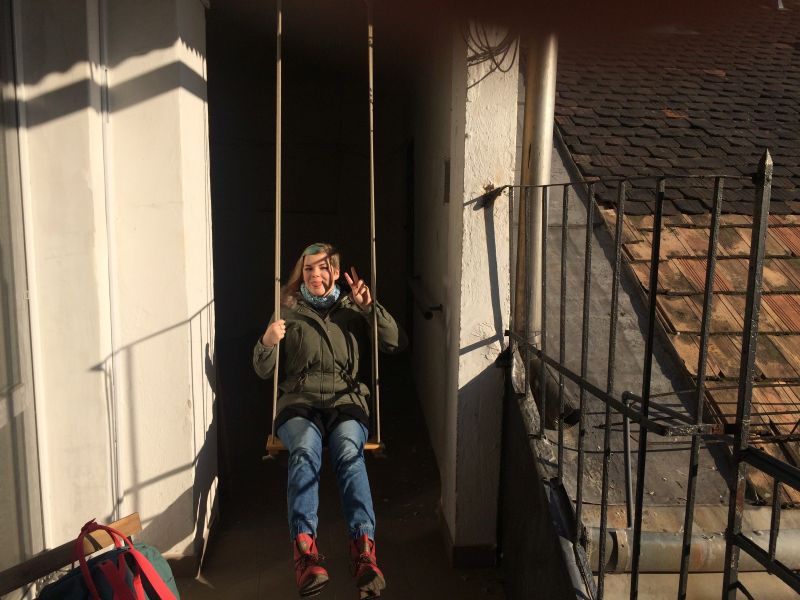Nóry byt je úplně v centru, blízko Opery, v pavlačovém domě ve 4. patře bez výtahu. Vyšlapat všechny schody je na infarkt, ale odměnou je pak jediný byt v tomto podlaží a vlastní pavlač s houpačkou. Cena pronájmu víc než příznivá. Bohužel jsem nestihla vyfotit byt samotný, okamžitě jsme ho zavalili věcmi. Není tak zajímavý jako Benův byt v Berlíně, ale zase je čistší a útulnější.