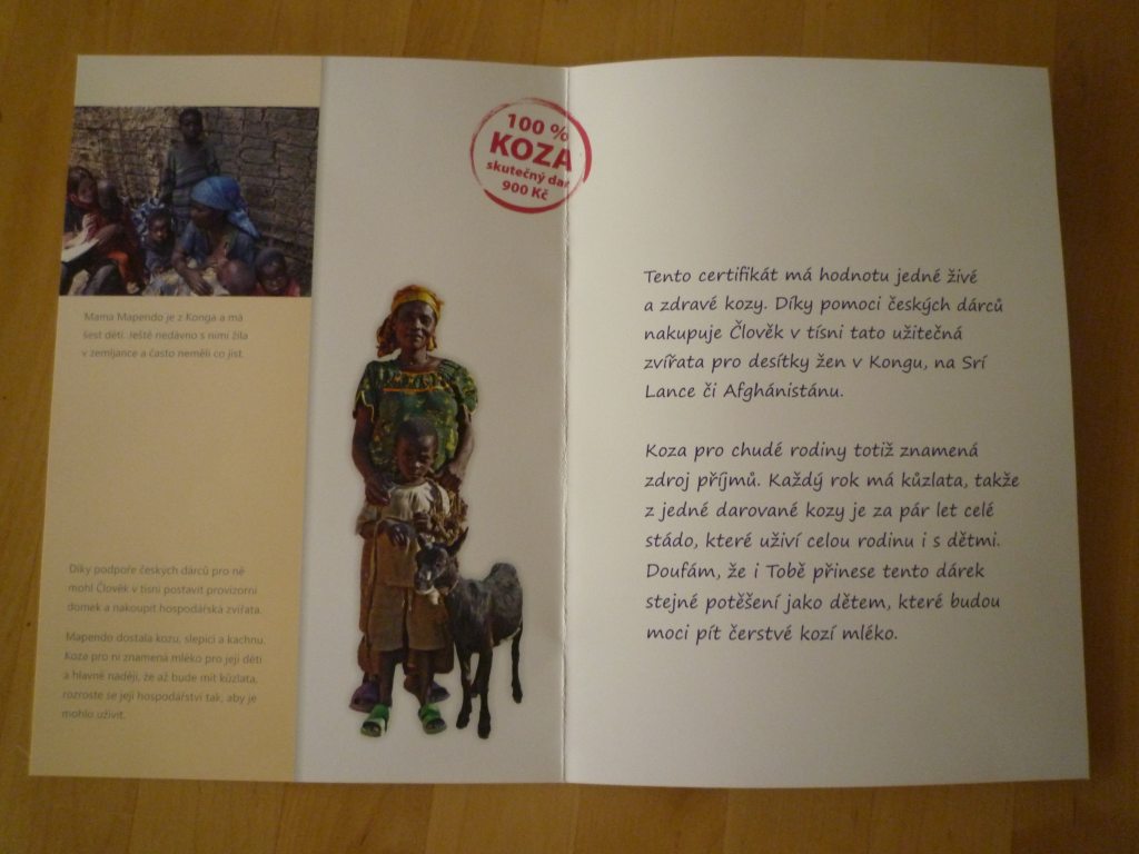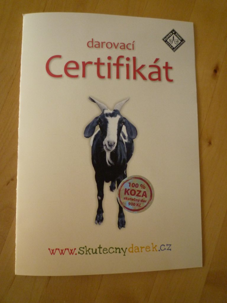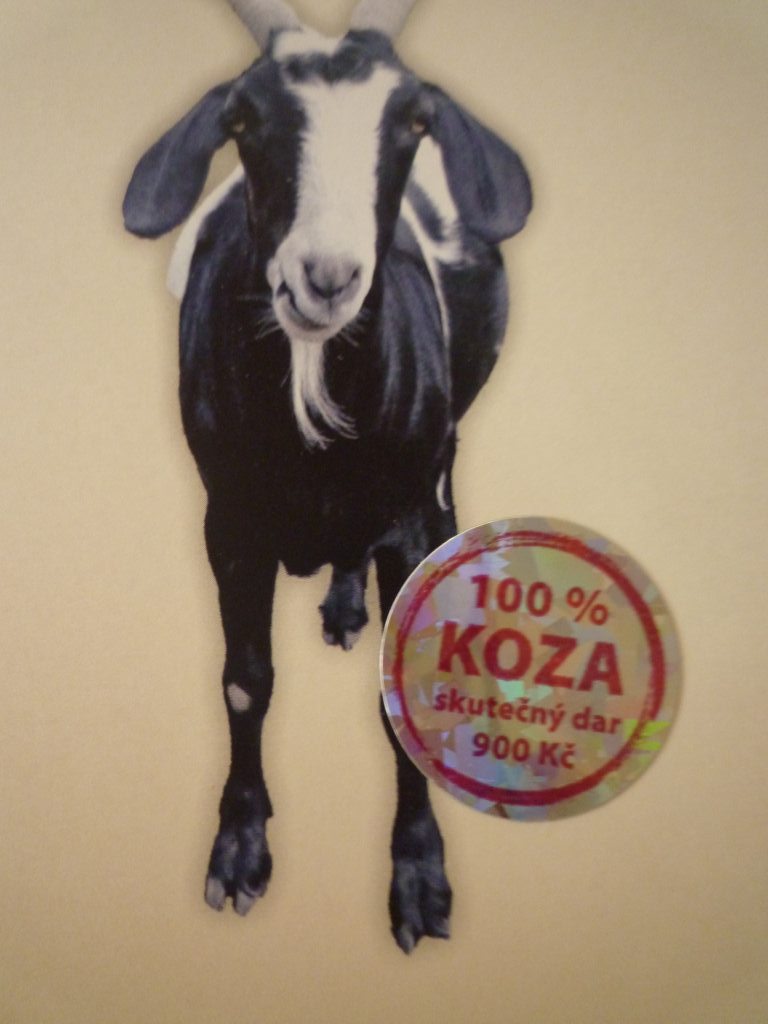 Můj muž dostane k vánocům veselou kozu. Chce ode mě vždycky hlavně překvapení, má ho mít. Ne, koza se nestane mojí kamarádkou, protože ji nebudeme mít doma. Fyzicky ji dostane chudá žena v Kongu, které pomůže v jejím těžkém životě, o němž já doma v pyžamu nemám ani ponětí. Pokud i vy preferujete tzv. jiné dárky, koukněte na www.skutecnydarek.cz. Garantem je Člověk v tísni.